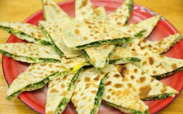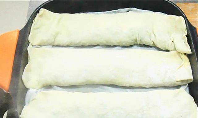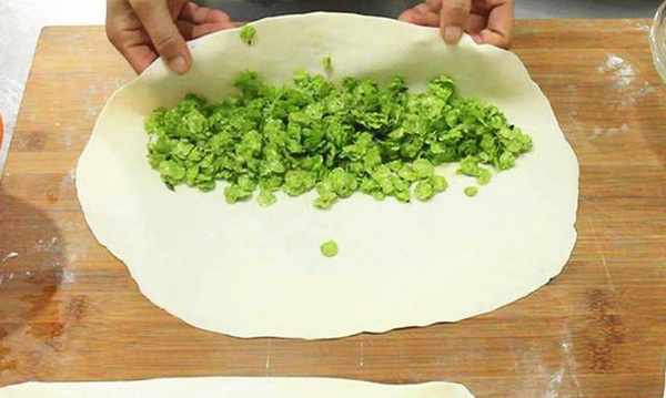 3.案板上撒些面粉,取出做好的面团,揉成长条摊成大小相等的面团,揉好面团一块一块擀成面团,尽量厚一些。中间和周围较薄,因此不易填充。然后把调好的榆钱馅倒在面皮上铺平,再把面皮对折成长方形,用力压住开口处,菜蟒的生身就做好了。