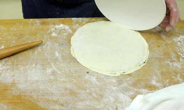 包好后,在上面放一层荠菜,打一个鸡蛋,盖上一块面团,用盘子擀一下,不要流汁,按照这个方法一个一个做。