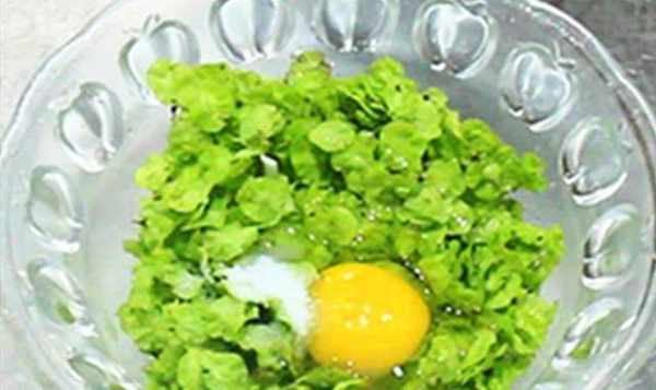 我们从树枝上摘下榆钱,用清水洗净,沥干水分放入盆中,加入葱花,打入一个鸡蛋,加少许盐和适量香油拌匀.做一个压痕。