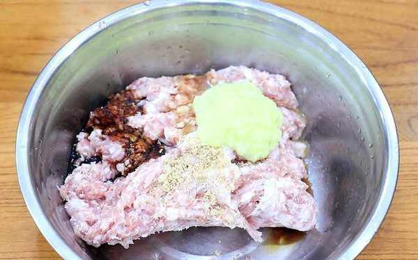 倒入刚做好的蒜姜水,顺着一个方向搅拌,让肉馅吸收香料,加入更多的洋葱和姜水,拌入猪肉冻。这个搅拌时间需要3分钟,然后再加入葱姜水,再搅拌3分钟,肉末多次吸收葱姜水,分散的肉末逐渐成团,加入马齿苋和混合。均匀地。