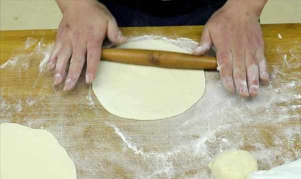 取出面团,用小擀面杖擀开,擀成圆形面团。擀的时候最好中间厚点,边缘薄点,这样包子会更薄更好吃。把面团一个个擀好,取出面团,左手拿着做好的肉馅,右手拇指和食指捏在一起,把所有的包子都按照这个方法擀好。