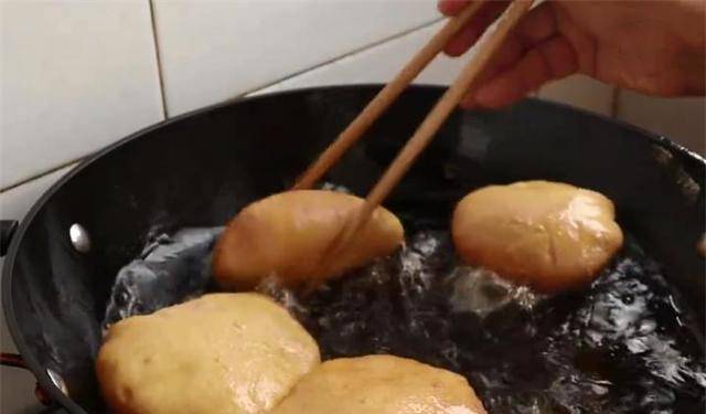 3、一切就绪后,开始下油锅炸。当锅里的油有70%热时,把油倒进锅里,用中火煎。然后,用筷子不断地刮饼子的肚皮,使饼子鼓起,另一面煎。翻过来煎另一面,两面金黄时取出。
