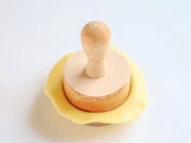 7、擀好的面团放入挞模里,用榉木棒压平