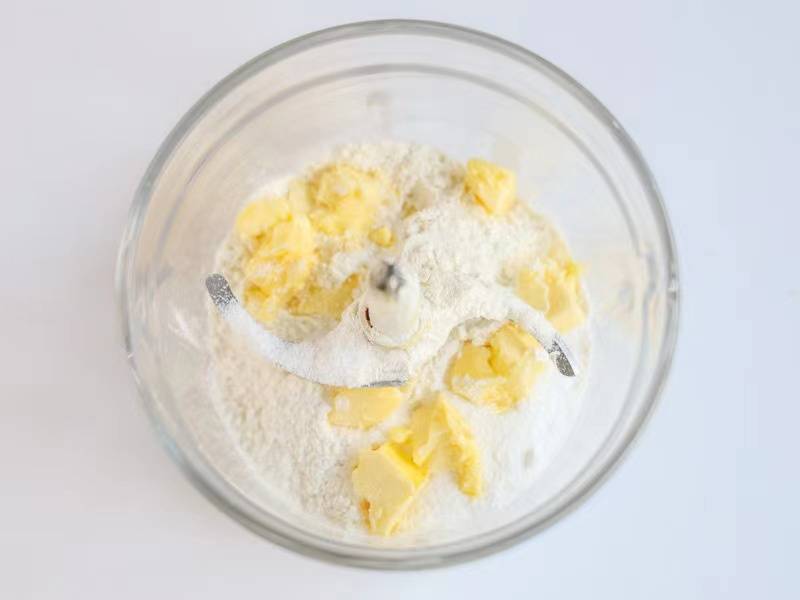 2、黄油切成小块,将切小块的黄油和面粉、糖放在搅拌机里,使黄油和面粉混合