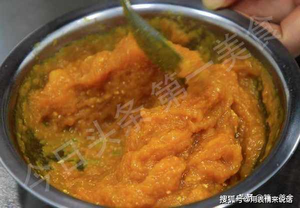 增加南瓜的甜度,用勺子按压成南瓜泥,打入