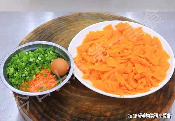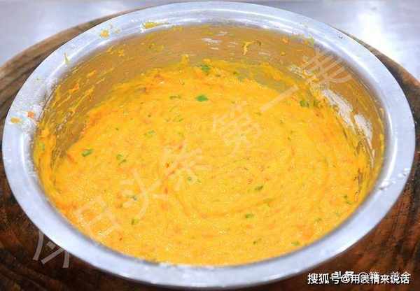 南瓜蒸好以后先把里面的水分倒出来,再捣成南瓜泥,打入一个鸡蛋搅拌均匀,把刚刚切好的胡萝卜丁和葱花倒进去搅拌一下,趁热加入