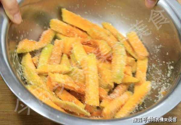 搅匀,植物油方便起酥,而且能使炸出来的南瓜条更加鲜亮。