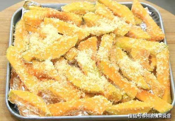 烤盘中铺上锡箔纸,这样热力更加均匀,把南瓜条整齐地摆放在里面,烤箱预热3分钟以后把南瓜条放进去,用