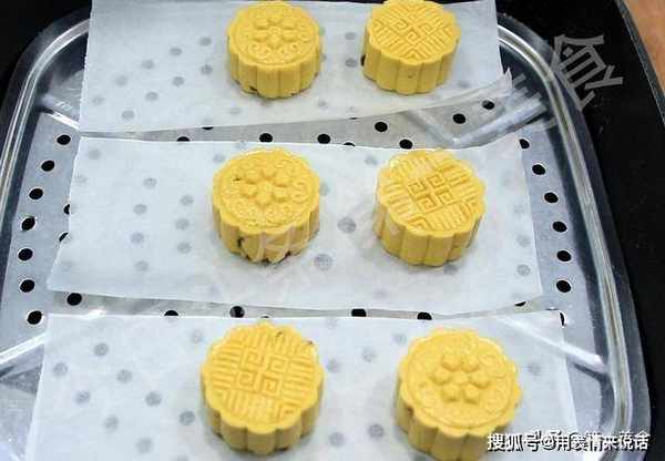 在蒸锅内放上篦子铺上一层吸油纸,把月饼坯放在吸油纸上面,开中火