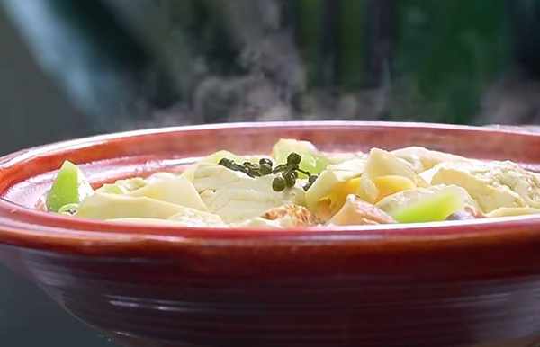 豆腐蒸熟后,加入生菜,继续炖至熟透并入味。