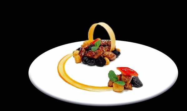 猪肝、乌鸡松、甜椒、蜜豆、肥肉、葱、姜、蒜、盐、白糖、五香粉、鸡粉、老抽、生抽、黑胡椒、白兰地、生粉