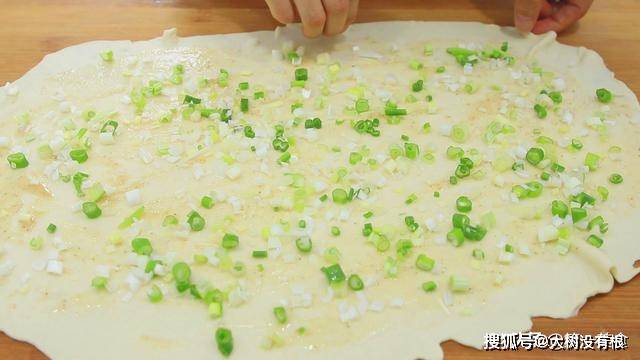 用刷子均匀的刷好油酥,撒上葱花。