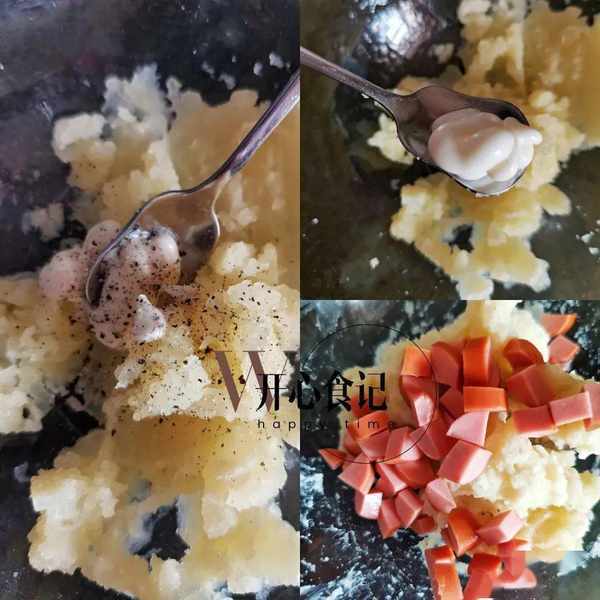 3. ️压成土豆泥,加入沙拉酱、盐和黑胡椒碎拌匀,再加入脆皮肠丁,搅拌均匀。