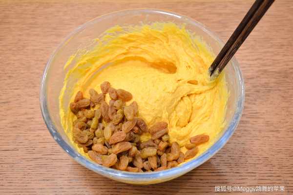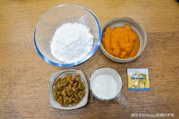 【材料】低筋面粉250克,干酵母3克,南瓜泥300克,牛奶90克,葡萄干100克