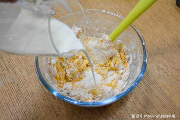 4. 面粉和南瓜泥拌成团后,少量多次加牛奶;