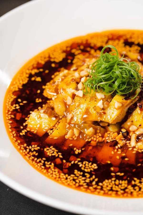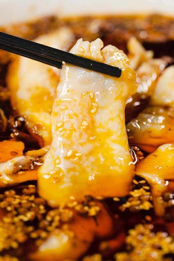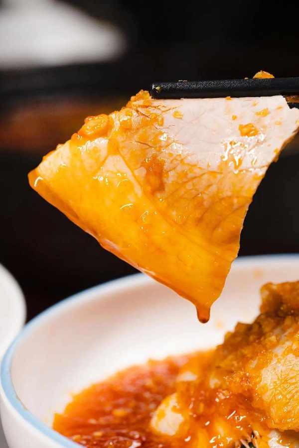 薄而透亮的白肉裹上红油,用美丽来形容不为过。放入口中,酱汁的浓郁香气与肉香糅杂在一起,爽口不腻还略有回甘,一块一块停不下来!