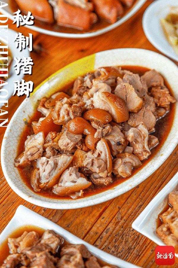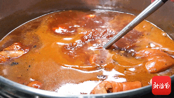 80斤的猪脚为一锅,明火卤汁煮上1小时以上,秘制香料的香甜渗入其中,猪皮染上美妙的红褐色。 肥瘦相间,软糯多汁, 尤其是皮肉交接的部分,好吃得不得了。