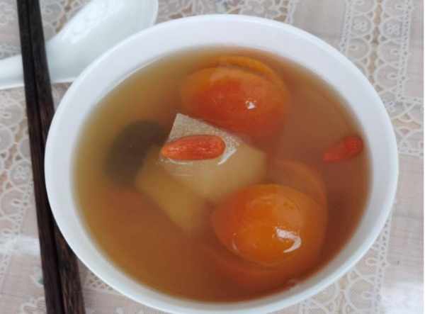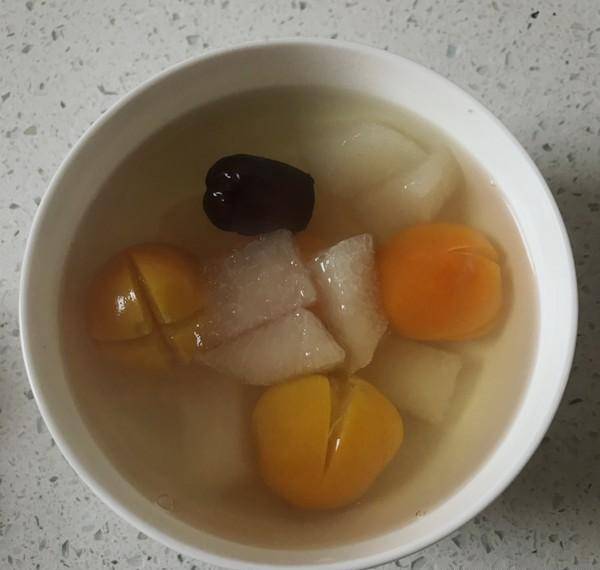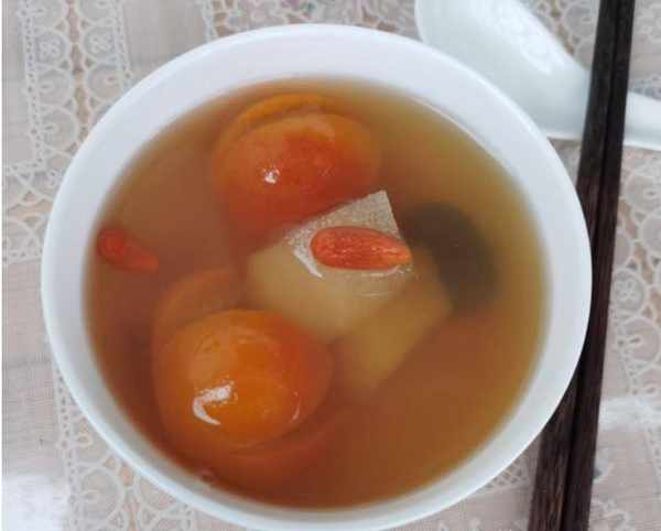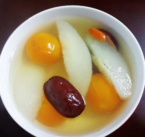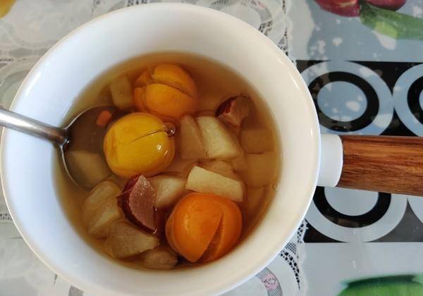 【烹饪小贴士】:金桔雪梨红枣甜汤是一款甘甜的止咳汤,几种水果要清洗干净,雪梨果皮有很多残留物质,金桔一定要用食盐浸泡和擦洗,金桔最好切块煮,几种水果放入炖锅煮沸,最后放冰糖和枸杞子,记得先大火炖煮,后小火慢慢熬制,关火出锅。