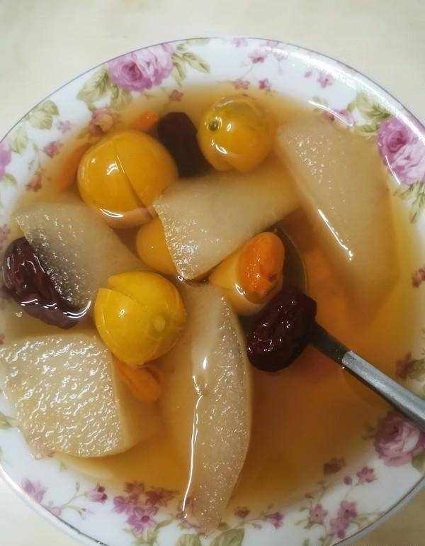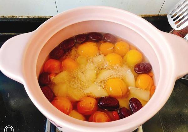 第六:等待汤汁舀起来非常黏稠,关火,出锅,这道口感清甜,汤汁黏稠的金桔雪梨红枣甜汤就做好了。
