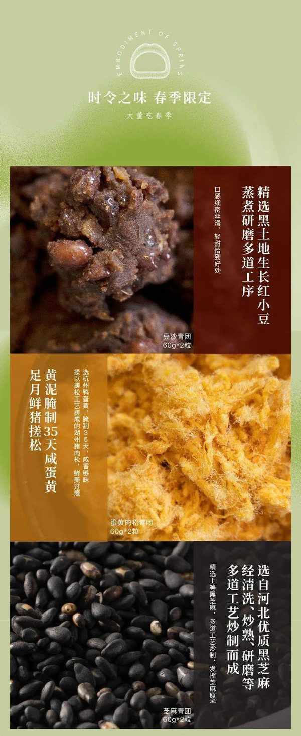 于是便有了这份大董这份青团,青团从原材料搭配到口味研发,都是大厨指定研制!
