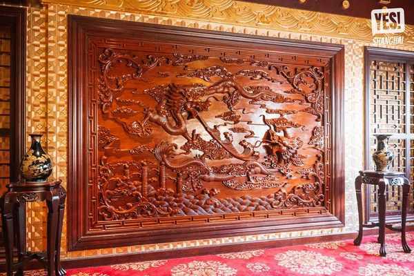 巨幅龙纹木雕壁饰、金丝红线绣成的牡丹花与灵活生动的鲤鱼花纹壁画等,营造了独树一帜的国风意境之美。