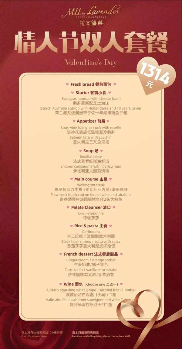 拉文德·慕法式西餐厅MU by Lavender诚意推出仪式感满满的情人节双人套餐,沉醉于味蕾上的至臻享受,让绵延情意在香颂美馔中流转,从餐前面包到饭后甜点都有惊喜。