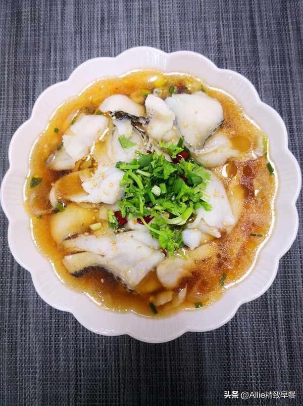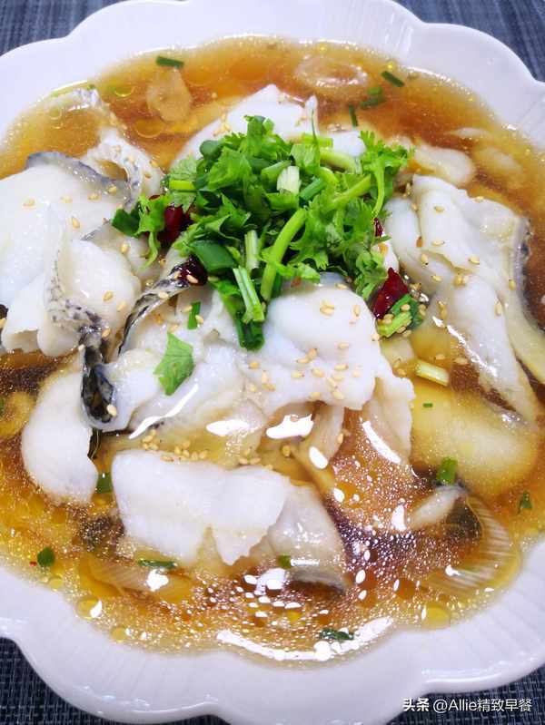 将煮熟的鱼片放入刚熬好的汤中,加入适量熟白芝麻、葱花、干辣椒,倒入热油,撒上香菜,挤几滴柠檬汁。