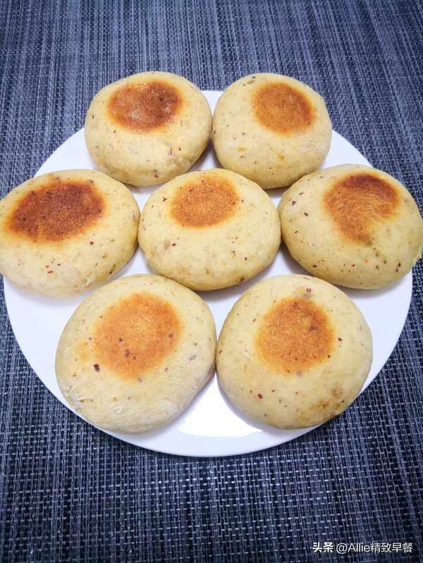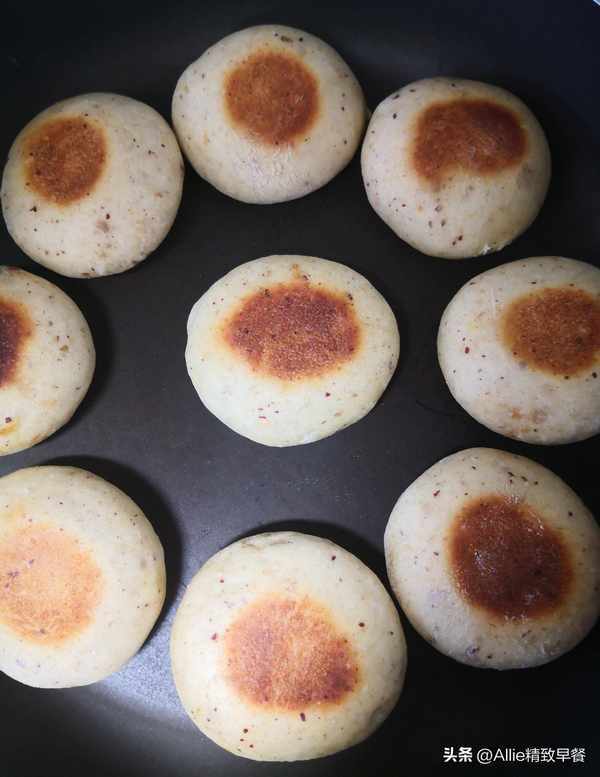 平底锅不要刷油,把小饼胚放在平底锅里,每个胚之间留一些空隙。