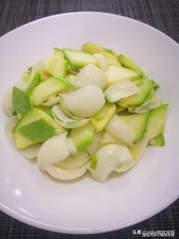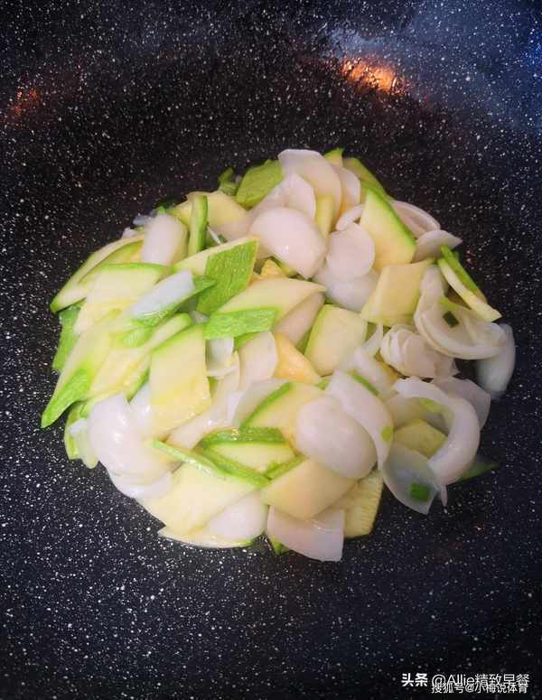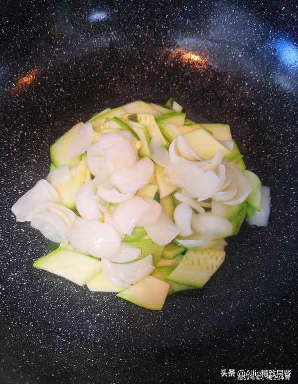 西葫芦切成薄片,加少许盐,拌匀腌10分钟,然后倒掉水,锅里加少许油,油热后放入葱花炒香,倒入在西葫芦炒至碎,倒入百合。