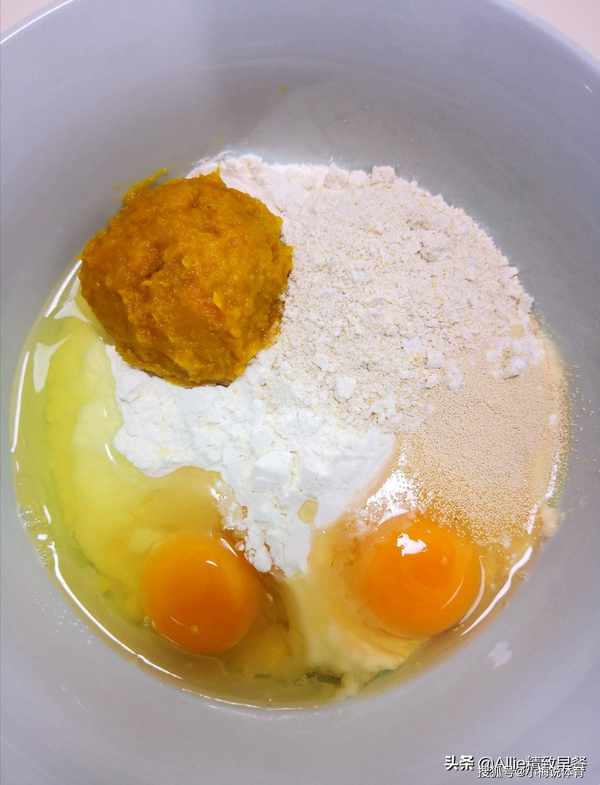 将南瓜泥、莜麦粉和高筋面粉加入碗中。三者的比例为1:1:5。打两个鸡蛋以增加蓬松度并增加营养。加入1茶匙玉米油,约5克,加入少许干酵母。酵母的用量仅为面粉总重量的1%。由于南瓜泥水分多,鸡蛋也是液体,加入酵母可以完成发酵,避免水分影响面团的硬度。