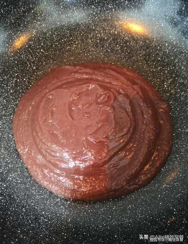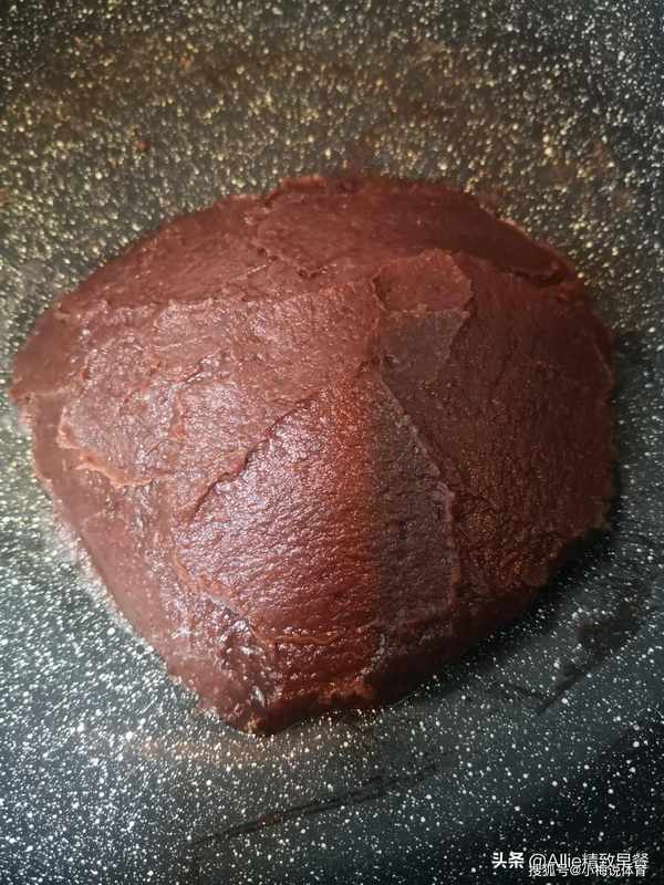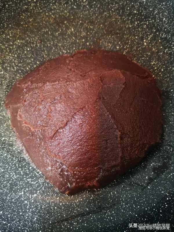 将红豆泥放入无水无油的锅中,用小火慢炒。