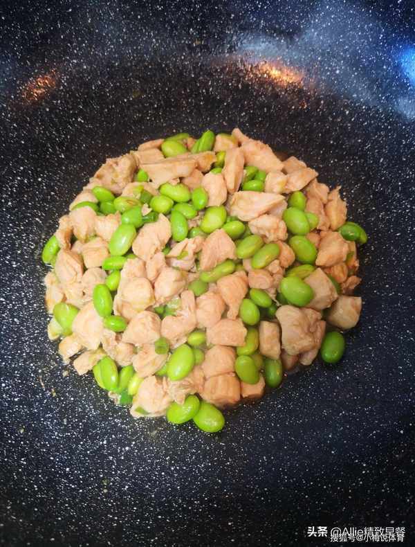 倒入预先煮好的毛豆,拌匀。由于毛豆和卤鸡都加了盐,所以我这里没有加任何调料,大家可以根据自己的口味调整。