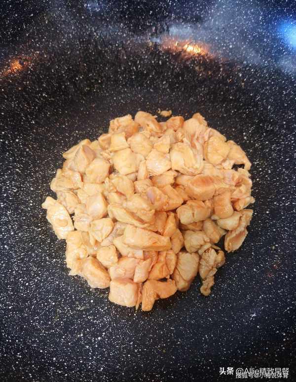 鸡胸肉切丁,加盐、生抽、老抽少许、淀粉,反复拌匀,腌20分钟热锅冷油,放入小红葱翻炒出香味出锅后倒入腌制好的鸡肉,炒至肉变色。