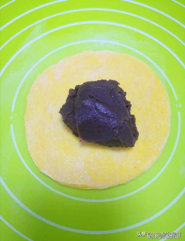 将每根面擀成中间厚边薄的圆形面片,加入适量豆沙馅。