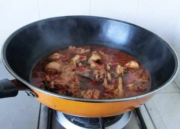 5、炒香后加料酒,倒入高汤或清水,放入盐、糖、生抽