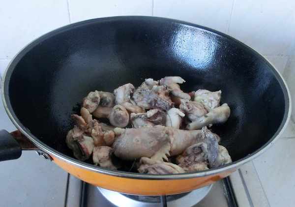 3、锅内放油,入鸡肉丁、姜、葱末炒至变色