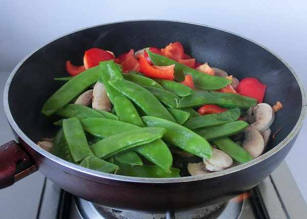 3. 再倒入荷兰豆、红椒,继续翻炒3-5分钟左右