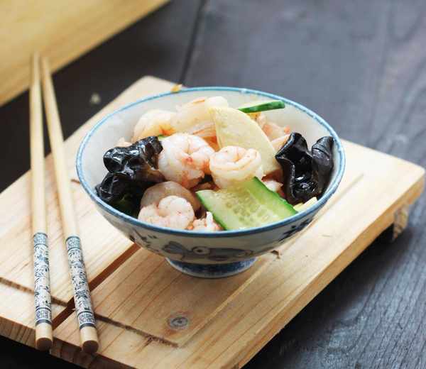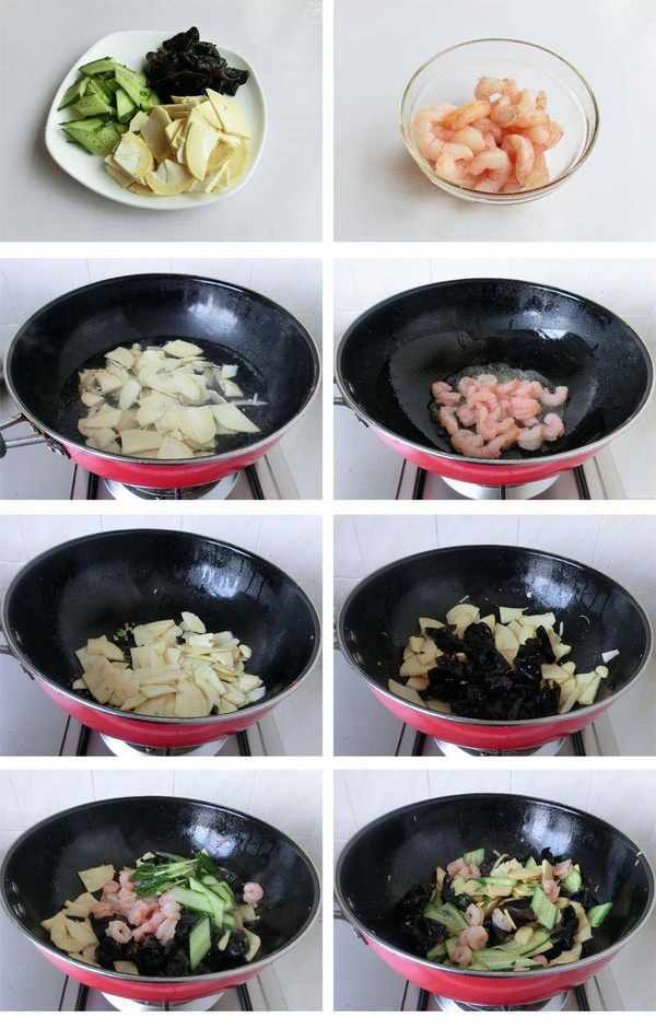 材料:虾仁200克,春笋100克,黄瓜1根,泡发木耳20克