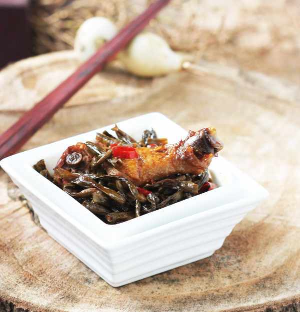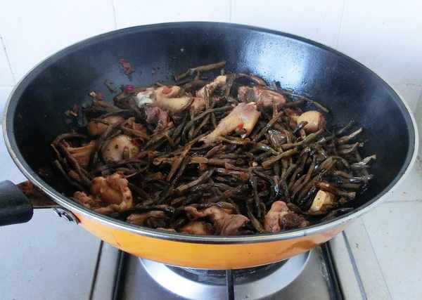 6、放入干豆角,炖至鸡熟,豆角软烂