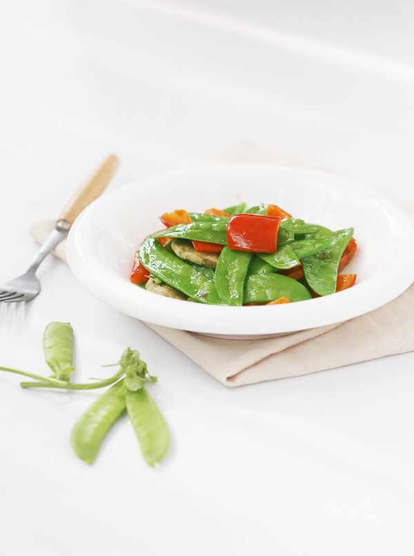 做法:1. 荷兰豆冲洗撕去两边的老筋,红椒、口蘑洗净切片
