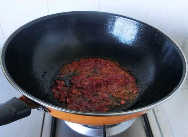 3、锅中放入油,放入剁碎的郫县豆瓣酱,炒出红油