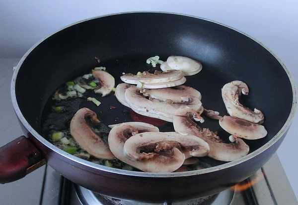 2. 锅中热油,放入葱、姜末炒香,下口蘑片翻炒