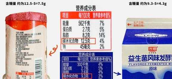 其次想控制糖摄入量的话,将营养成分表中碳水化合物的数字减去5,大概就是糖的添加量了。