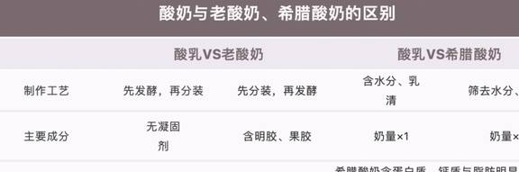 除此之外,老酸奶、希腊酸奶则是酸乳的“变种”,区别仅在于制作工艺和营养含量。