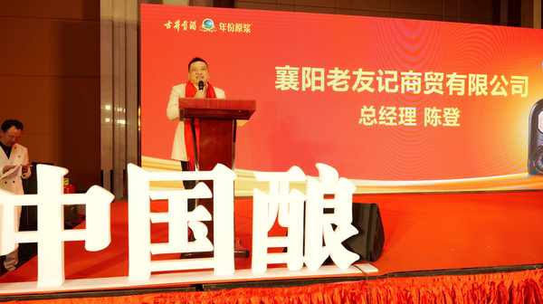 襄阳老友记商贸有限公司总经理陈登致辞,他说:“三年以来,打造一款让大家即有销售,又有利润的产品是我们孜孜不变的追求。公司团队丝毫不敢懈怠,唯恐辜负了大家对我们的期待和信任。2023年公司将秉承抱团取暖的总方针,做到三个坚持;一是坚持氛围营造、打造天、地、人网。央视、高铁、机场为天网,地网就是指各位终端门店生动化建设,人网就是指意见领袖的培养。二是,坚持为客户赋能的思路不变,通过开展诸如钓鱼、登山、周边游、回厂游等系列推广活动,打通古井销售的最后一公里,让我们的销售更顺畅。 三是,坚持客户至上,用心服务的思路不变,做到有求必应,保障有力,售后无忧。”