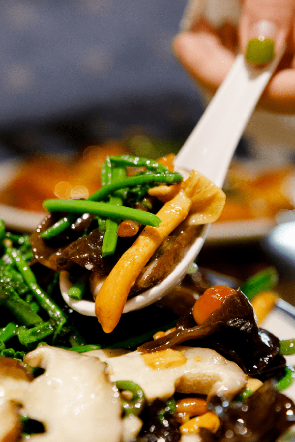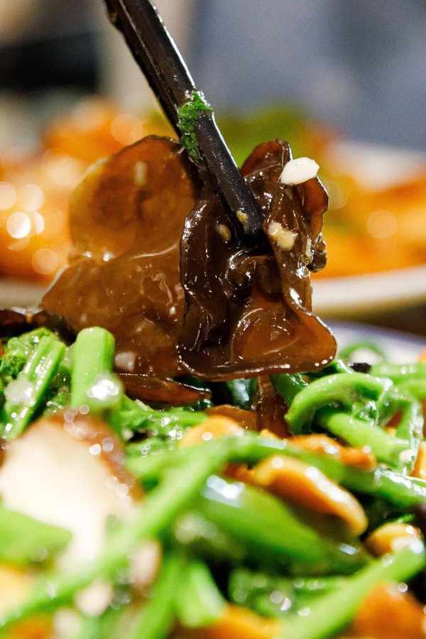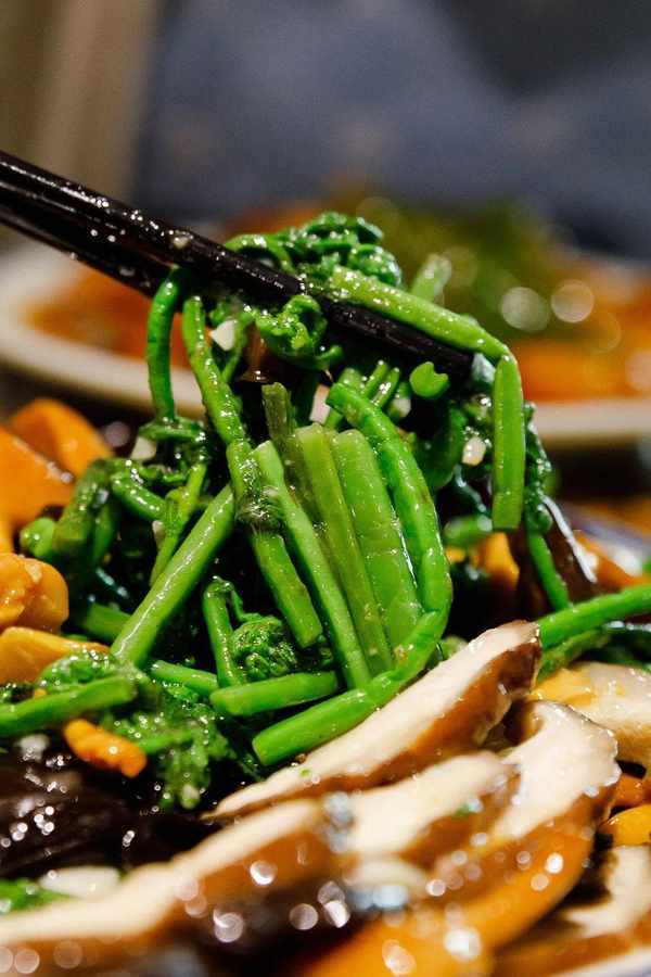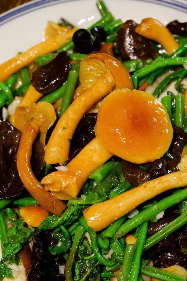 如果说上面的菜都是刺激味蕾的,那这一道菌菇 炒野菜,就是唤醒味蕾的! 一上桌色香味俱全,看着都忍不住要咽口水!