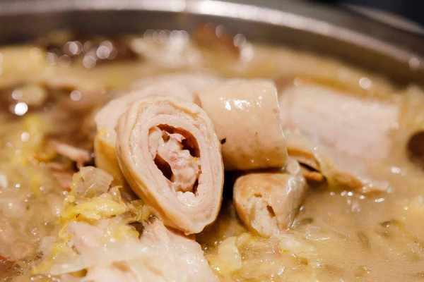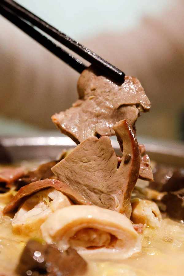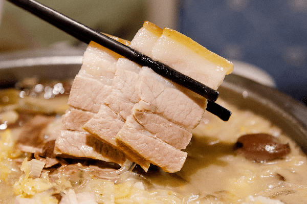 酸菜与肉的组合香气扑鼻,煮好的五花肉,肥而不腻;猪舌,肉汁丰富; 肥 肠,干净无异味 。