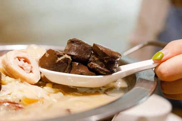 新鲜猪五花、血肠、肥肠、猪舌等,配上浓厚的汤汁,满满一大锅只要48元。