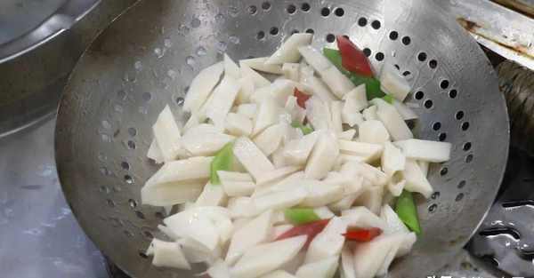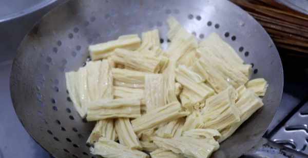 等水烧开后,下入切好的腐竹,用勺子翻动几下,使食材受热均匀,等水再次沸腾后,即可倒出控水,腐竹经过焯水可以去除里面的豆腥味。