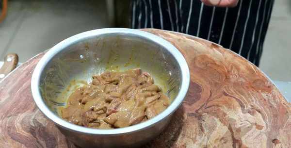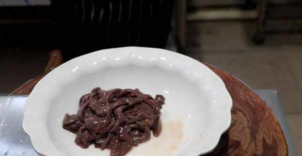 全部切好以后,放入盆中,添入适量清水,加入一勺食盐,用手反复抓洗,洗净猪肝里面的血水,放入漏勺中控水。连续清洗几遍,直到洗净血水为止,然后挤干水分倒入盆中。